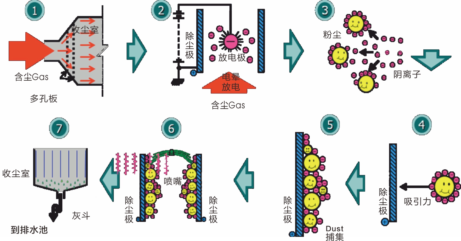 主要由殼體、進(jìn)口煙箱、陰極系統(tǒng)、陽(yáng)極板/管、水沖洗系統(tǒng)(循環(huán)水系統(tǒng))、高壓電源、出口煙箱、氣流分布板、電控系統(tǒng)等組成。